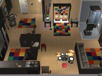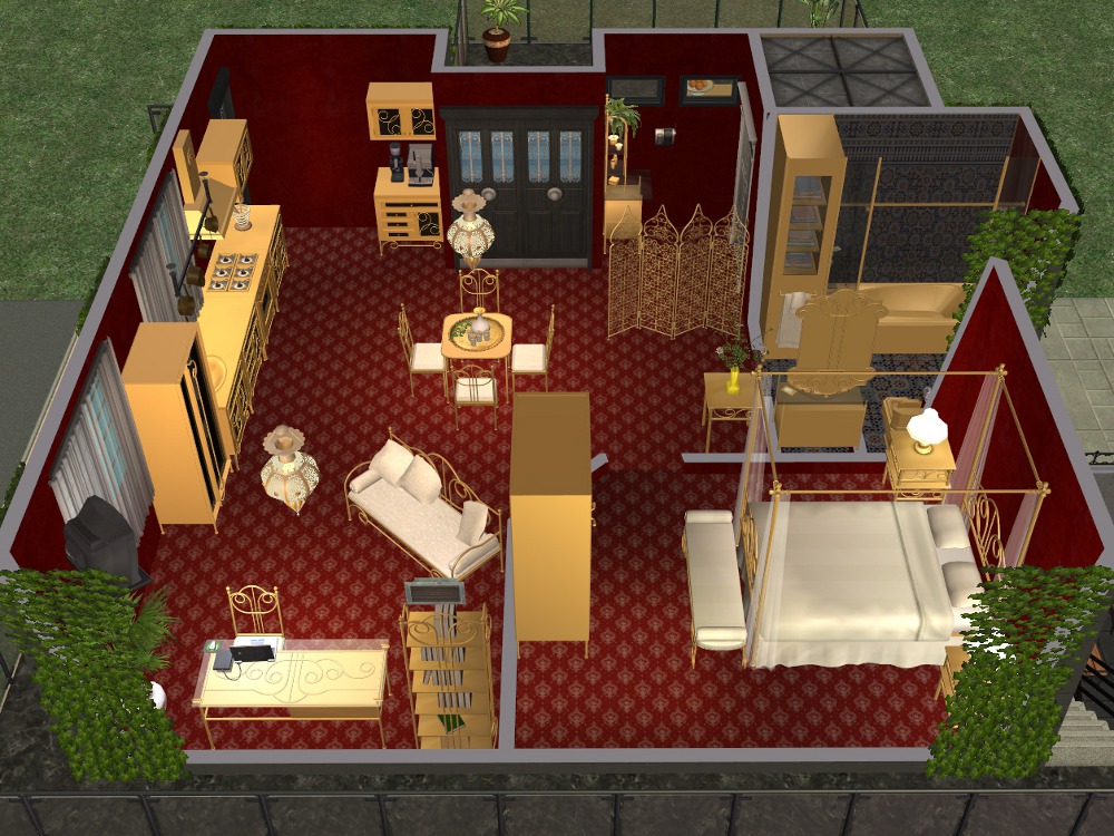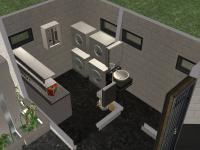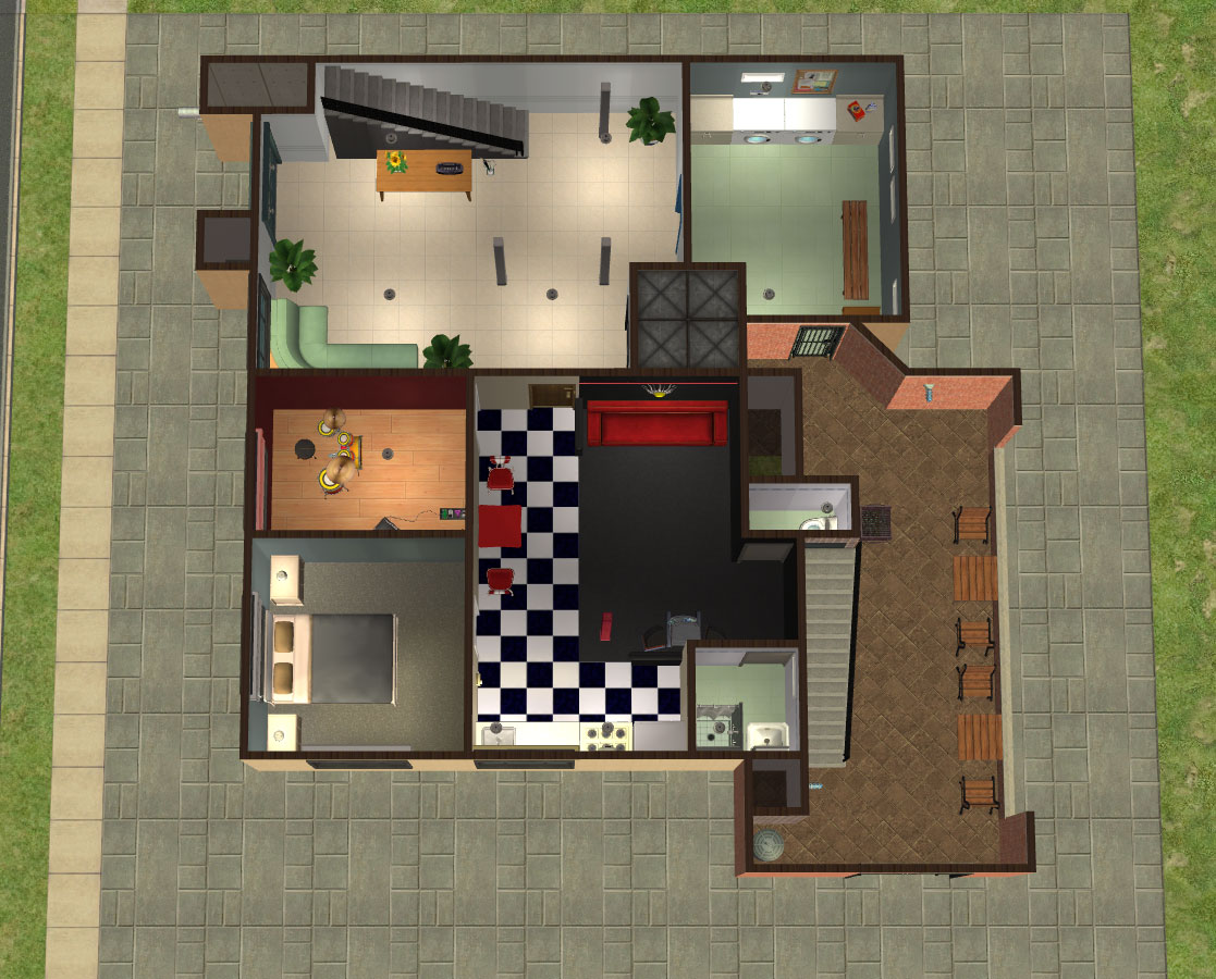 Sim amenities: laundry room (stole idea from Shell), bbq area in the back - part of wall replaced with a fence cos of a rampant simdozer during renovations. Roof area - chess table loungers. DID have a hot tub but removed cos tester sims just lived in the darn thing.