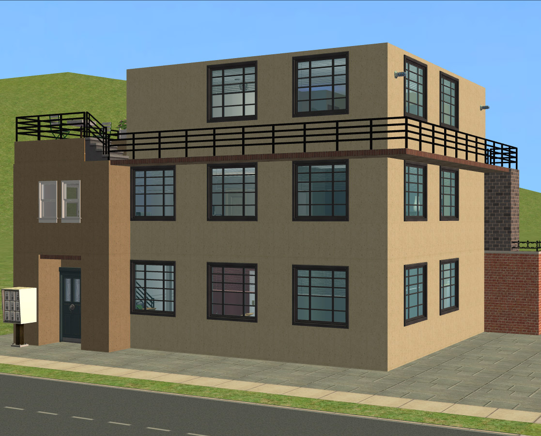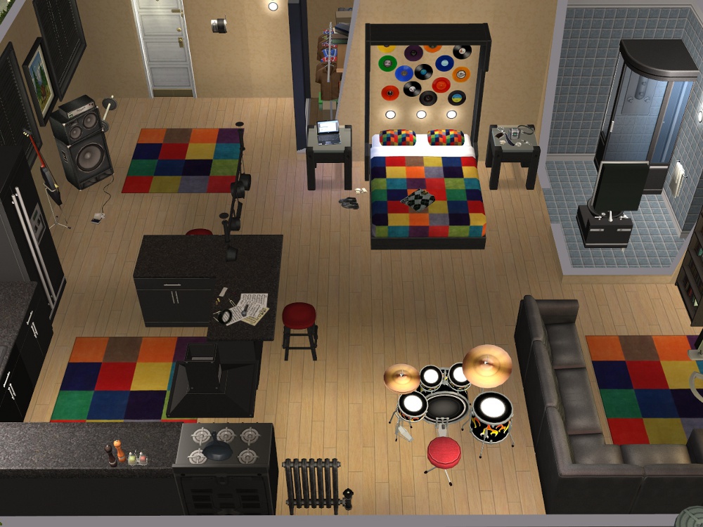 Top apartment is of course the bachelor pad - accessible via the lift or the fire escape.