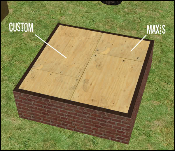 Glass blocks! Yes, Maxis included a photo-realistic texture, and yes, it was marked as a floor. This is slightly edited from the image as it comes out of the game files; Maxis' image has two blocks, cloned to make four, but right on top of each other, which would've resulted in very obvious tiling stripes. It will probably also make a better illusion if you have the OFB room divider fences, but in a small enclosed room, it should be fine.