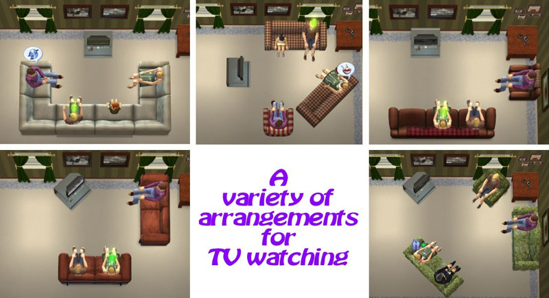 So this is a mod that allows the watching of TV from those sorts of chairs. Since a picture is worth a thousand words, have a look at the pictures for more information. This mod also allows the watching of TV from much further back making large cinema rooms usable. From my testing, a Sim can watch TV sitting in a chair that is 10 squares back from the TV, and probably much further too.