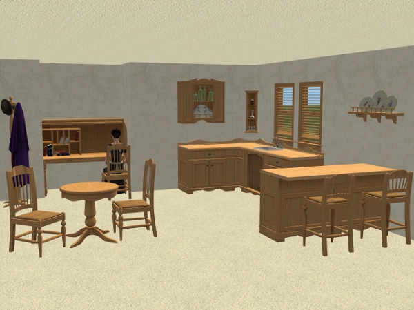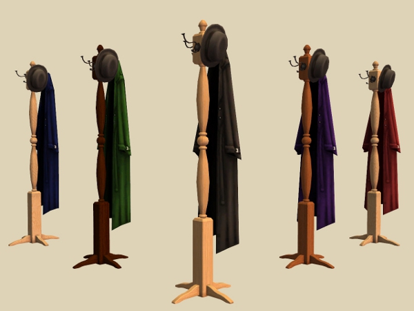 3 recolour of the Seasons, A Less Threatening Rack, A Not-So Lonely Shelf, Auntie May's Barstool, Coat Rack De Lovely, Rack-O-Plates, Rancher's Round Table, The Cozinator 450 & The Rollin' Secretary From McKraken Industries using Apartment Life wood colours. Also 6 Coat Rack De Lovely, COAT recolours, Black, Blue, Green, Orange, Purple & Red.
