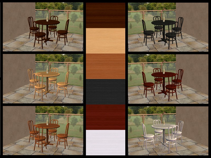 SimWardrobe's Round Cafe Table & Chair recoloured in AL Wood colours. Many thanks to amythestfenix for the 3 extra wood colour.