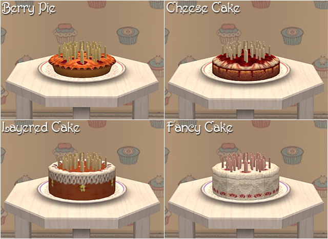 One of the things Jo wanted was some new birthday cakes. So I baked her some. Big Grin Or rather, I took some tasty in-game tarts and birthday cake-ified them. They're all found in Misc. -> Party.