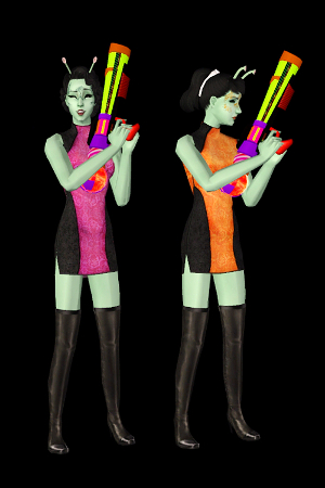 I needed some sexy, retro sci-fi alien dresses for a Totally Maxis submission. Io's Trifle Dresses seemed like they could work, so I added some thigh-high boots to make them look more "space" themed. Comes in Io's original colors plus an extra green and pink.