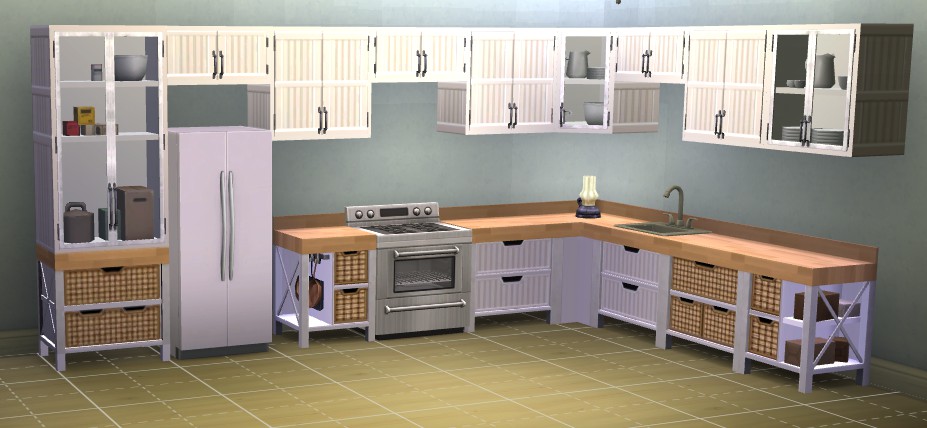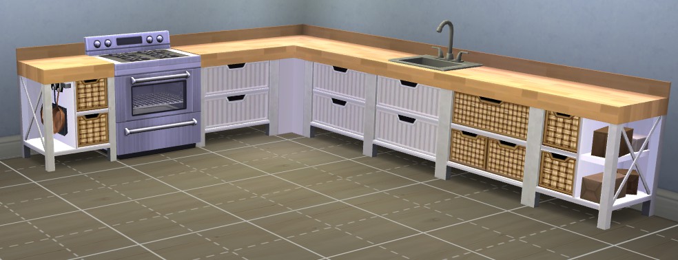 Yes, am double posting. Sorry. But here are the (probably) finished counters. I don't think I'm going to keep the bamboo version in the last post. I really wish I could do something about the corner counter, which is a stupid mesh to begin with. Why does it go all the way down? Why not have the bottom between the legs raised like the rest? Also want to add beadboard to it, but can't find that area on the map. So am done for now Wink Also a clock and kitchen chalkboard.