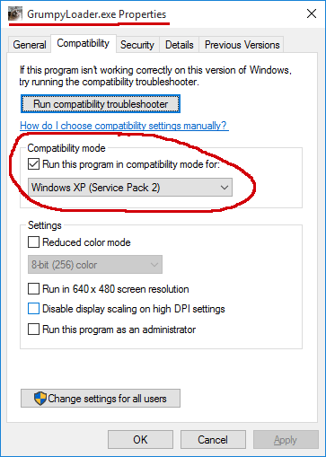 Hmm this is weird. I just went to my Sims2EP9.exe file properties to get a screenshot and indeed there's no compatibility tab. But earlier I was testing on another .exe file, totally unrelated to Sims, and it did have a compatibility tab. There was also definitely a compatibility tab on the .exe files I used to install the game - those were the AutoRun .exe files on the original game CDs, and the Grumpy Loader .exe file.