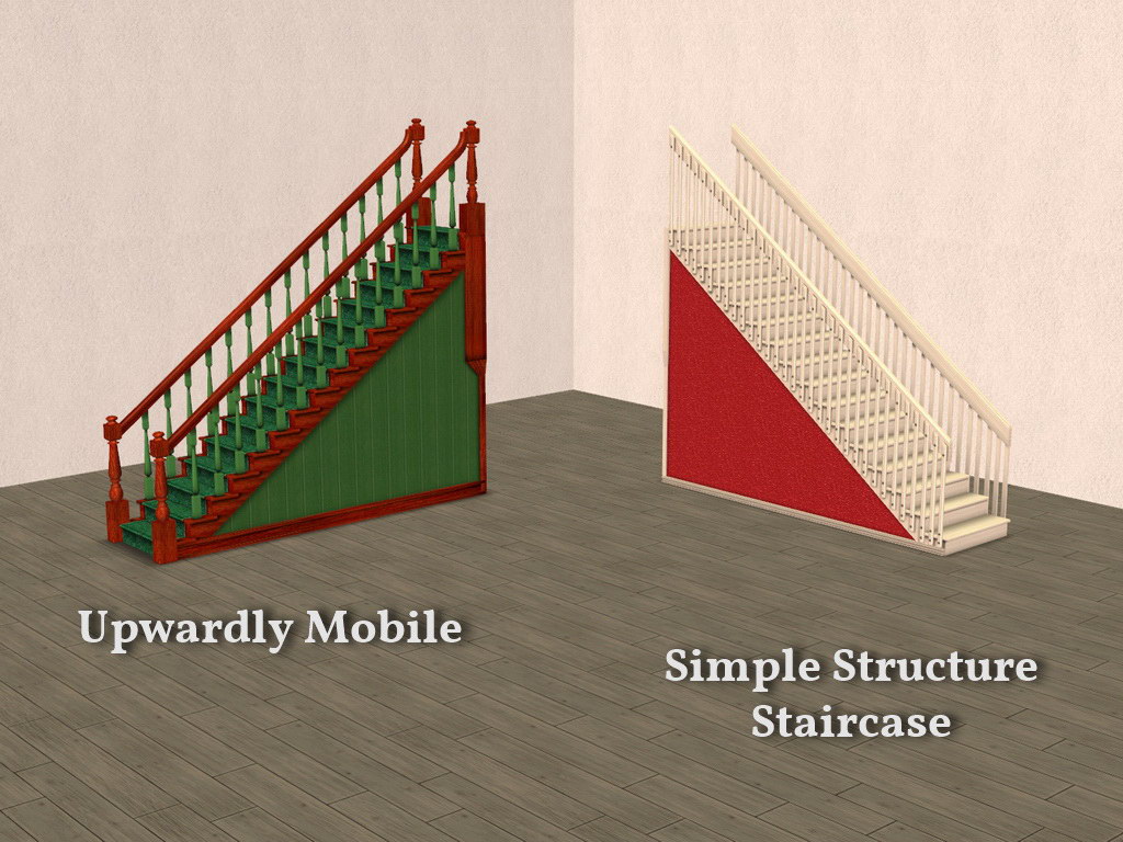 These are the same old Base Game staircases, now with less arm-waving. As pictured, more than one sim can use them at the same time, in the same direction. Upstairs, downstairs, with arms up, with arms down!