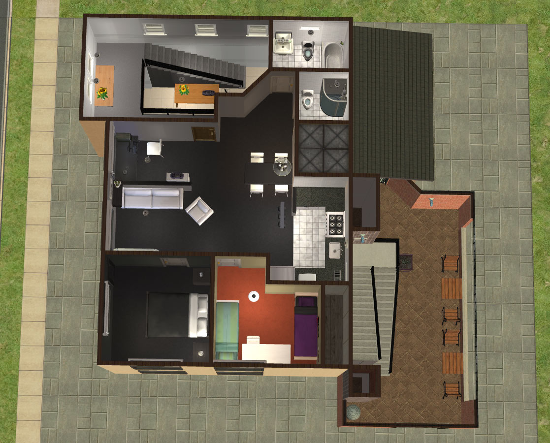 Sim amenities: laundry room (stole idea from Shell), bbq area in the back - part of wall replaced with a fence cos of a rampant simdozer during renovations. Roof area - chess table loungers. DID have a hot tub but removed cos tester sims just lived in the darn thing.