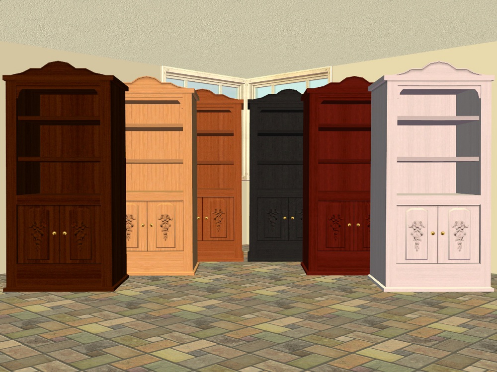 Zip file includes my altered 'TSM Archive Bookshelf1.package', new OBJ, new UV map, Template, Shadow and door knob overlay as well as my 12 recolours. Hope that all makes sense to you.