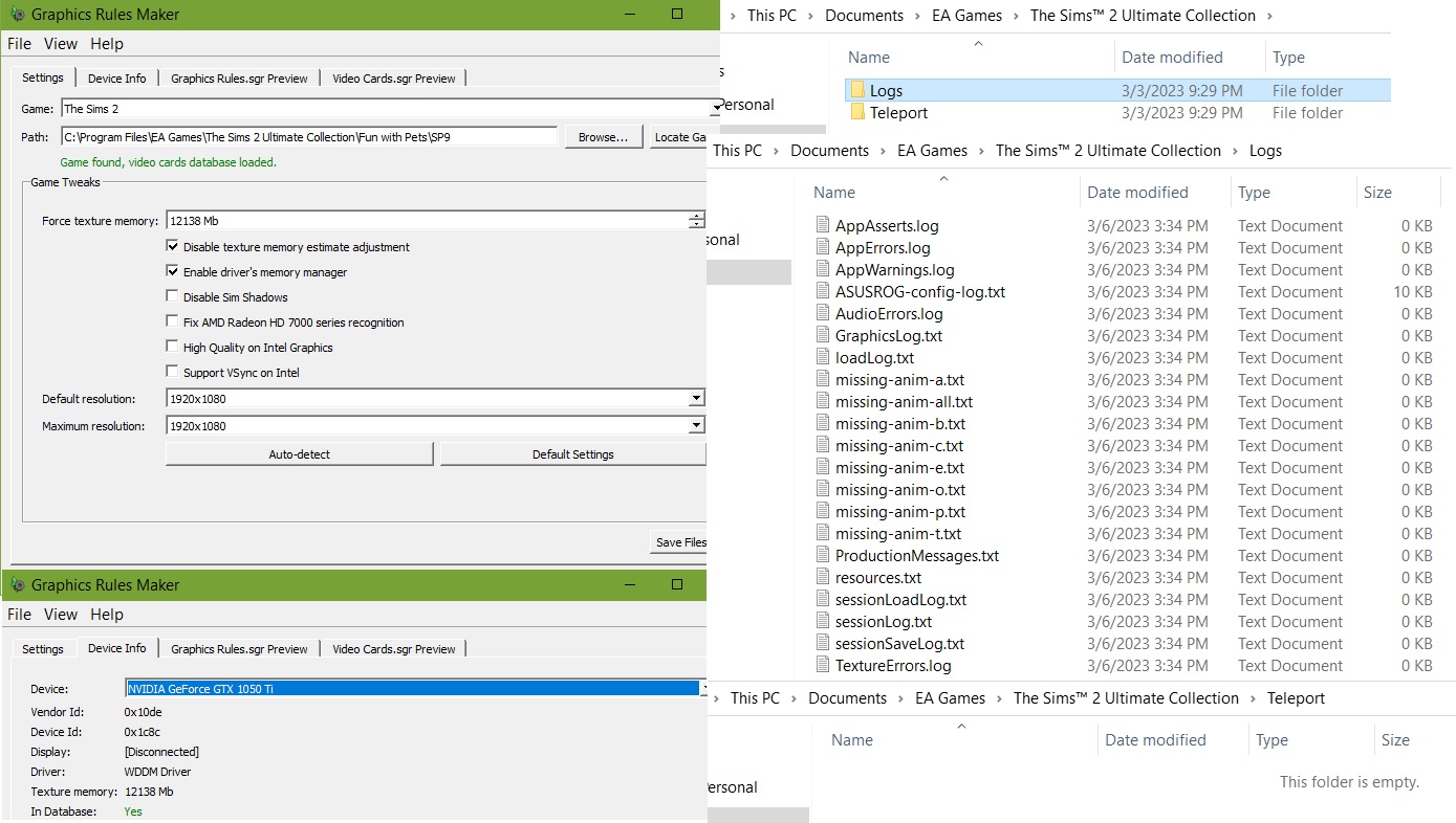 Ahh gotcha, that's right it will show all those other folders & files when the game can run. Since that didn't work, I end up uninstalled/reinstalled TS2 again. But now the Config-log doesn't show NVIDIA graphics card, and I did the GRM + 4gb patch again. I added it to this post just in case it shows something that causing the game not to run. But if the NVIDIA graphics suppose to run the game, I can re-do it over in the NVIDIA Control Panel so the Config-log can show NVIDIA graphics card. I really appreciate your help!