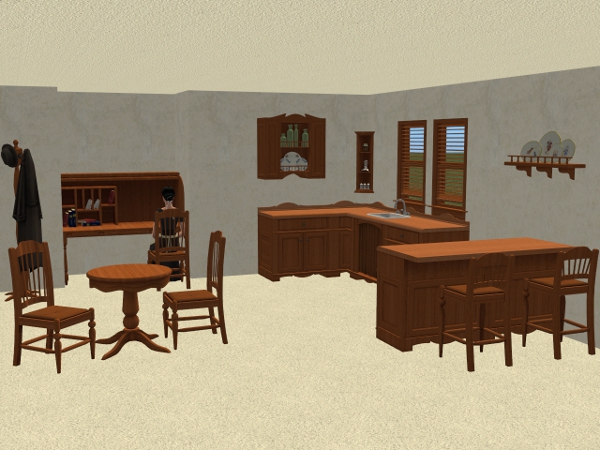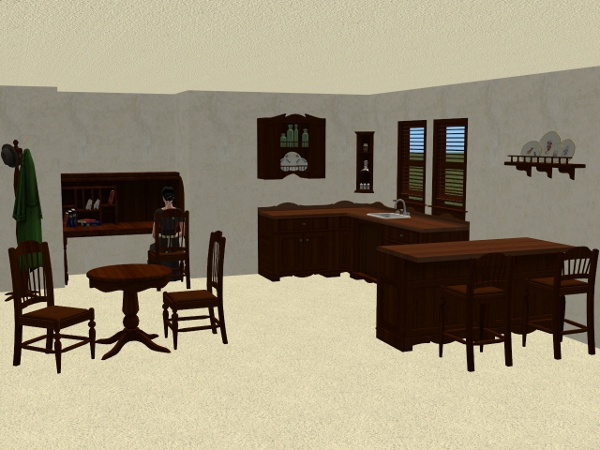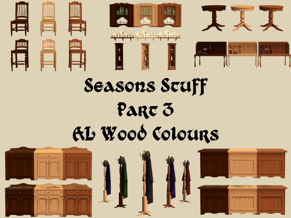 3 recolour of the Seasons, A Less Threatening Rack, A Not-So Lonely Shelf, Auntie May's Barstool, Coat Rack De Lovely, Rack-O-Plates, Rancher's Round Table, The Cozinator 450 & The Rollin' Secretary From McKraken Industries using Apartment Life wood colours. Also 6 Coat Rack De Lovely, COAT recolours, Black, Blue, Green, Orange, Purple & Red.
