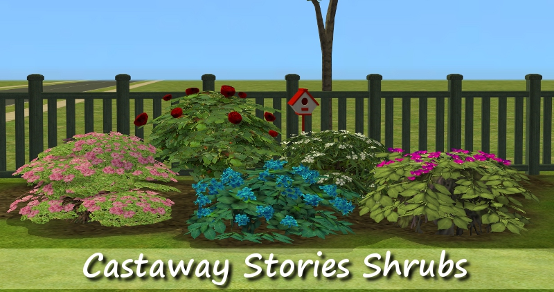 Here are the oversized versions of the shrubs from Castaways Stories. They're slaved to the basegame shrubs so there's no duplicate textures (which makes for a smaller package file) and any recolors you might have for the basegame shrubs will also work for these.