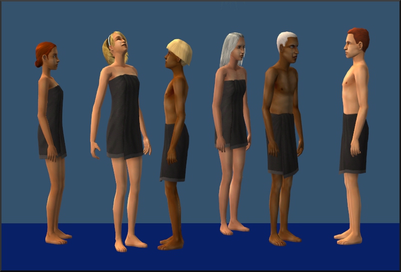 There's three different colors to choose from for each age and sex. I wasn't sure the best way to upload these but decided to upload them by color. For instance, if you want all of your sims to wear black towels when they get a massage all you need to download is the black file (which contains all six towel default replacements) plop it in your downloads folder and you're good to go.