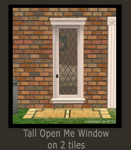 The tall window is a repositioning of an original remesh by Windkeeper; her original window (which was a remesh of a Maxis original) can be found on TSR. This is just a 2 tile version of that mesh and I have credited Windkeeper's work in the object. This window is repository linked to the NL window and so will pick up any recolours of the Open Me window you have in your downloads folder.