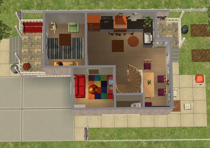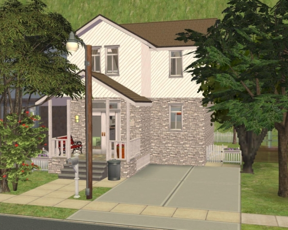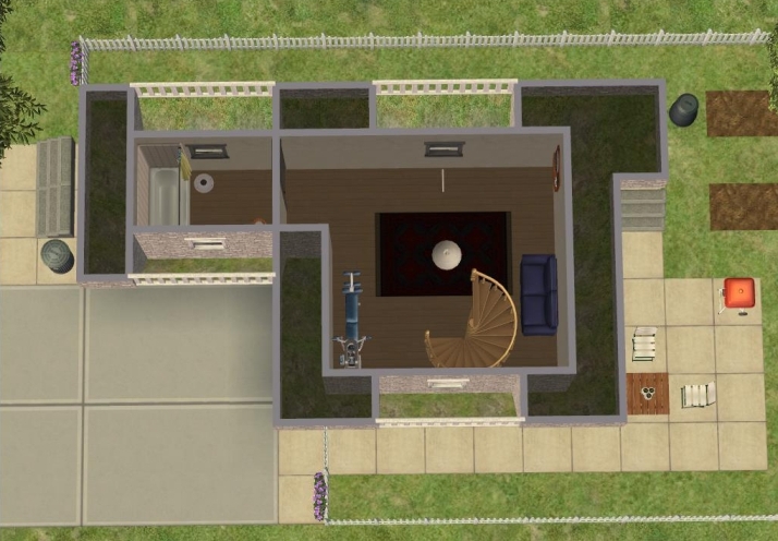 This small but perfectly formed 1x2 family home is currently designed to house 2 adults and 1 child, but the upper rooms could easily be jigged around to add a second bedroom, or you could even convert the basement into a crash pad for a teenage sim. There is a small garden with plots for growing produce, a patio and barbeque, and a couple of fruit trees, and a parking space for the family car. A small covered porch at the front forms a welcoming entrance, leading to an open-plan ground floor with a cosy nook for reading and watching TV or playing games. Downstairs is a small bathroom and exercise machine, and upstairs is the two bedrooms, a study area on the landing, and another bathroom.