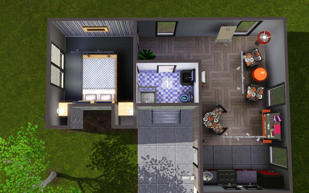The house is geared towards a single sims or couple starting out. It is fully furnished with some skilling items and even a TV! The furnishing is basic, so start saving up early so you can upgrade the bathroom and kitchen.