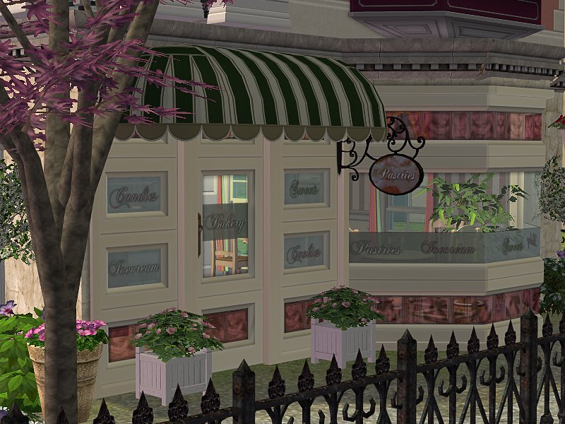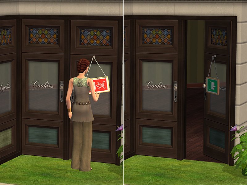 Basically it's a completely huge set of doors and windows. The DOORS have slots on them so you can click in deco that moves with the door!!!!! (Lee, I'm going to have a look at how they did that for the sign idea that we had). This works not just for the overlays they made to go with the door, but also the existing decor! Needs a mod to use with wall hangings. But look! A use for those Wreaths and things we got with Celebrations and Holiday Fun Pack. AND you can finally put the open/closed sign on the door!