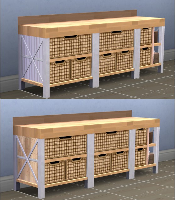 Yes, am double posting. Sorry. But here are the (probably) finished counters. I don't think I'm going to keep the bamboo version in the last post. I really wish I could do something about the corner counter, which is a stupid mesh to begin with. Why does it go all the way down? Why not have the bottom between the legs raised like the rest? Also want to add beadboard to it, but can't find that area on the map. So am done for now Wink Also a clock and kitchen chalkboard.
