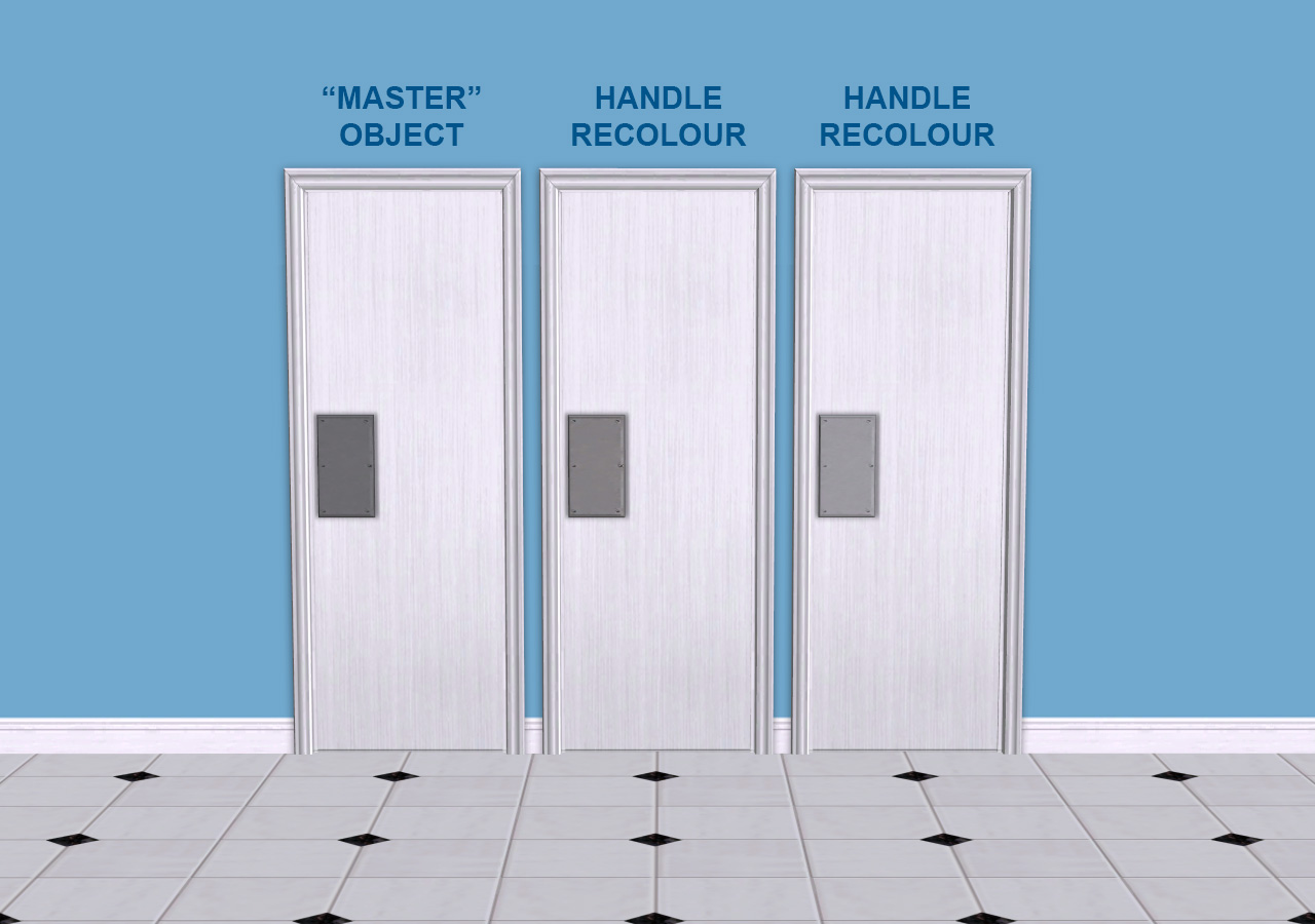 The handle and window textures are in the "MASTER" object - the solid single door. You need the "master" for the others to work. The handle is recolourable. Two recolours are included. The window is not recolourable.