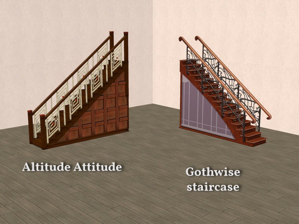 These are the same old Base Game staircases, now with less arm-waving. As pictured, more than one sim can use them at the same time, in the same direction. Upstairs, downstairs, with arms up, with arms down!