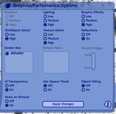 In game, I have all the low-med-high settings enabled, except shadows and smooth edges which are greyed out.