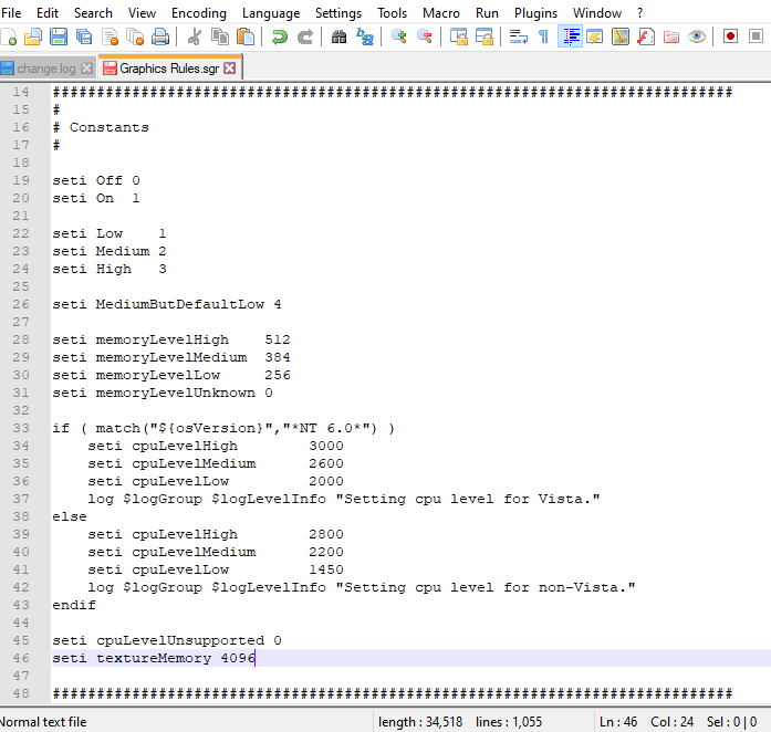 Other than increasing texture memory in graphics rules.sgr, I'm not sure what else to do. Somewhere around line 46 - 48, add seti textureMemory 4096, just below the if/else statement about os version.